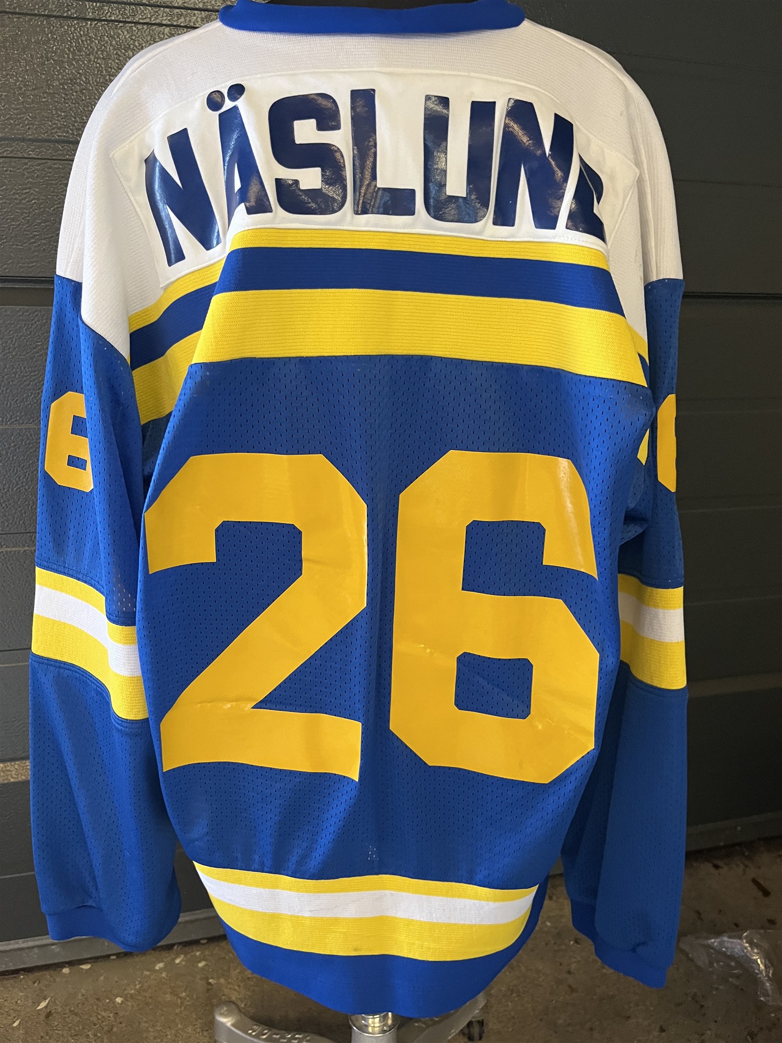 När försöket med samman- slagning av de två största lokala ishockeylagen gjordes tillverkades nya tröjor. Denna tröja # 5 användes aldrig på match men ibland på träningar. Onödigt det med men Lennart Svedberg spelade aldrig i den föreningen så misstaget att överhuvudtaget beställa en med # 5 är nog förlåtet.